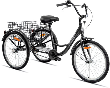 Трехколесный велосипед Cargo 1.1 от Aist оборудован большой корзиной для транспортировки малогабаритных грузов. На таком ситибайке удобно ездить за покупками, на дачу – вместительная корзина позволит перевезти все покупки, рассаду или собранный урожай за одну поездку. Аист Карго 1.1 очень устойчивый, надежный, прочный. Он собран на стальной раме, которая выдерживает большие нагрузки. Синглспид оснащен простыми ободными тормозами, полноразмерными крыльями из металла и защитным щитком на цепь.